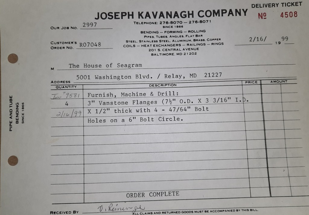 Another week starts on the corner of Central and Pratt with the usual assortment of rolling and bending and one holdover of ours from the distilling days. For almost 100 years, the Joseph Kavanagh Company’s main focus was the whiskey and beer industries. This ended years ago but occasionally, we get calls for some old parts such as Vanstone flanges. These are flanges for distilling systems and we made many of them in the past. My father always told me to never throw those away and sure enough, every few years we get a call for them from Seagrams. One day we shall run out but for now, they are pulled from a shelf in the upstairs machine shop and shipped out. We charge a flat rate for them and we’ll sell them as long as we’ve got them.
