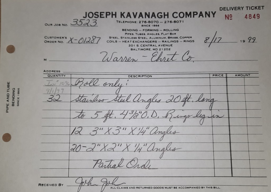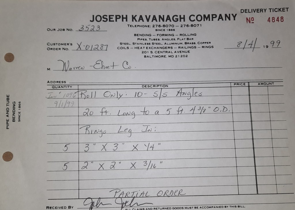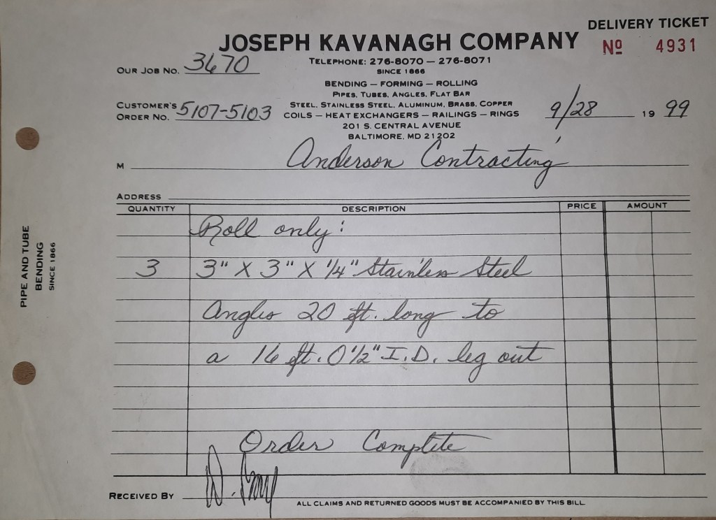 After an enjoyable week at home, I return with everyone else to the corner of Pratt and Central. Grudgingly, we get back to work. Taking this week off is a nice tradition. It started in the 30s when my grandfather, Eddie took his family to Ocean City for the first time. His father was rather dubious of this idea but when Eddie took charge of the Shop, it became a regular thing for the family and our crew. Eddie was always a strong union man and despite a prickly nature he did care a great deal about his workers and laborers in general. He was one of the founders of the Coppersmith Union in Baltimore. When Eddie retired, my father kept this August week vacation going and so have Ann, Jack and I. From a pragmatic standpoint, it’s often one of the hottest weeks of the year so we get to miss that. Anyway, we get back to it and start off with jobs for Warren-Ehret and Structural Steel.