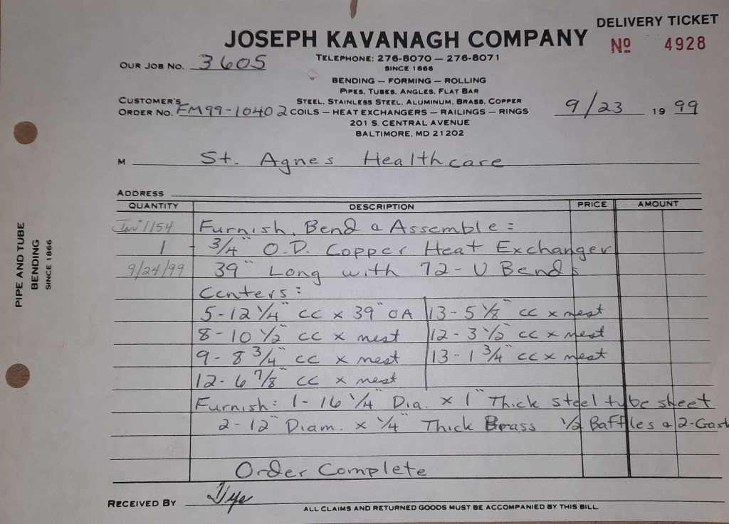 The Birds have stretched their winning streak to thirteen and maybe a miracle is in order. I’m at my desk talking about the team when I get a phone call from a student at Maryland Institute College for the Arts, Johnpaul Flick. He’s finishing his studies and his final project is a sculpture of a shopping cart. He told me. “I wanted to be three again” so he designed a large size shopping cart for an adult to ride in. This is definitely something different and there are some bends which need to be made so he came to the right people. I give him a price and he’s all for it. He’ll be sending material our way. I’ll add it to our backlog and schedule when the material arrives. It’s a busy day on Central Avenue as we complete a fair few orders for our usual customers and a heat exchanger for St. Agnes Hospital.
