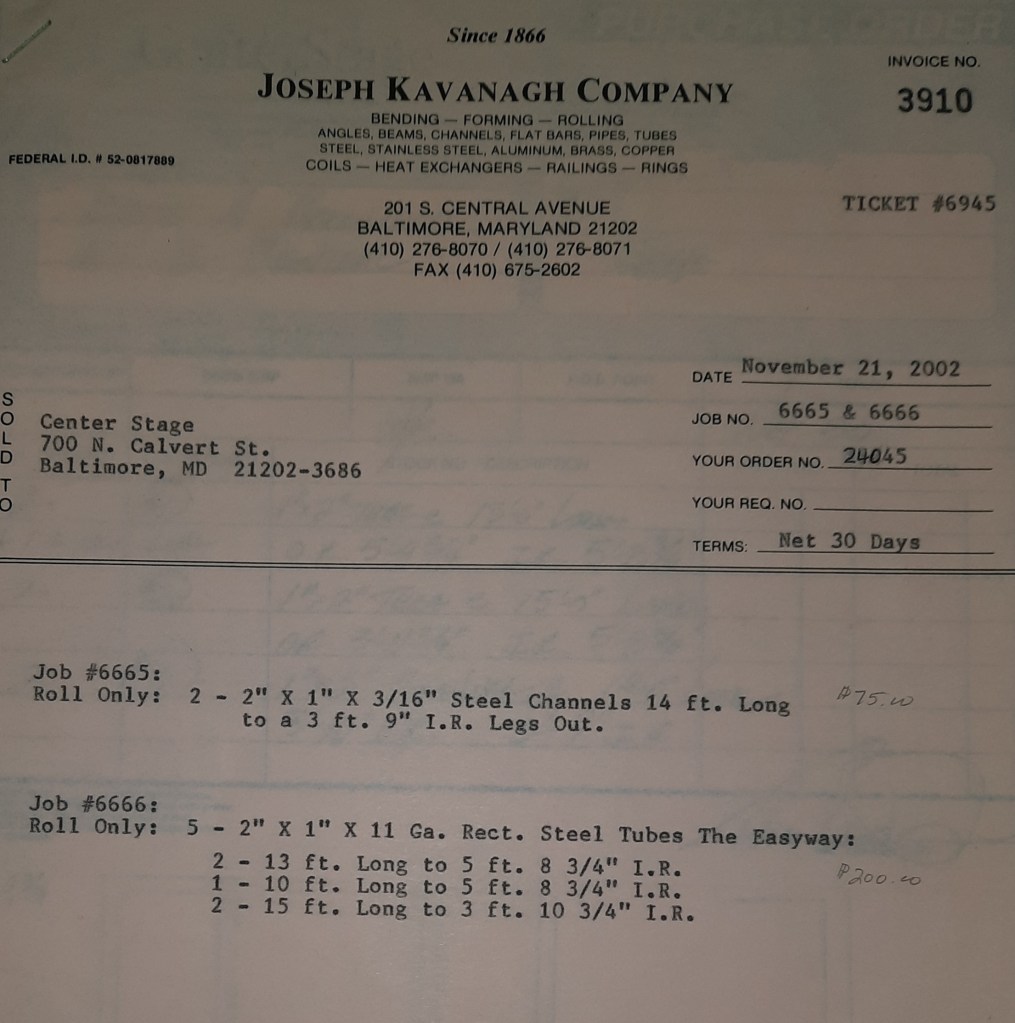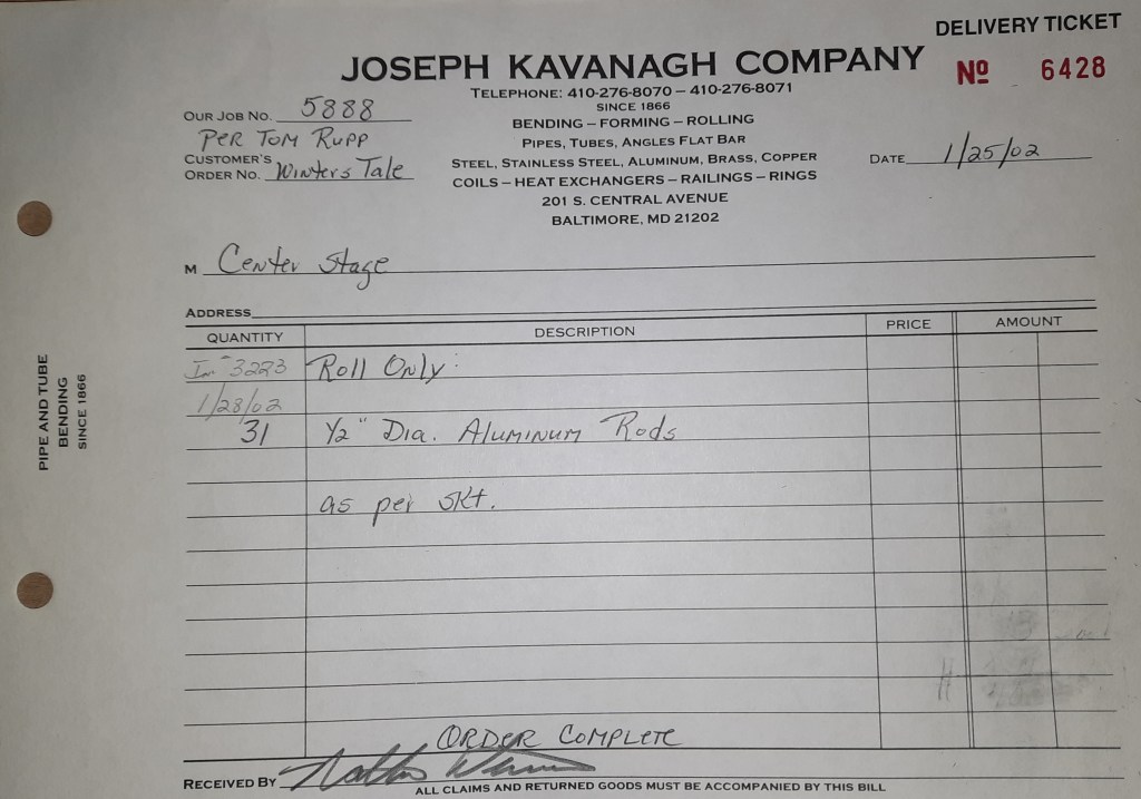 The year has started off strong as far as work goes and that’s a good thing. This week everyone has been a bit down after the Ravens lost to the Steelers. Today even more so as a miserable drizzle falls outside. It’s that Pittsburgh and Baltimore/DC rivalry. It keeps happening but life goes on. We finish some structural work for R and R Fab, Anderson Contracting and Metropolitan Steel. We also finish set parts for Center Stage’s production of “Winter’s Tale.” I rarely know the actual play being performed so it’s cool to know in this case.