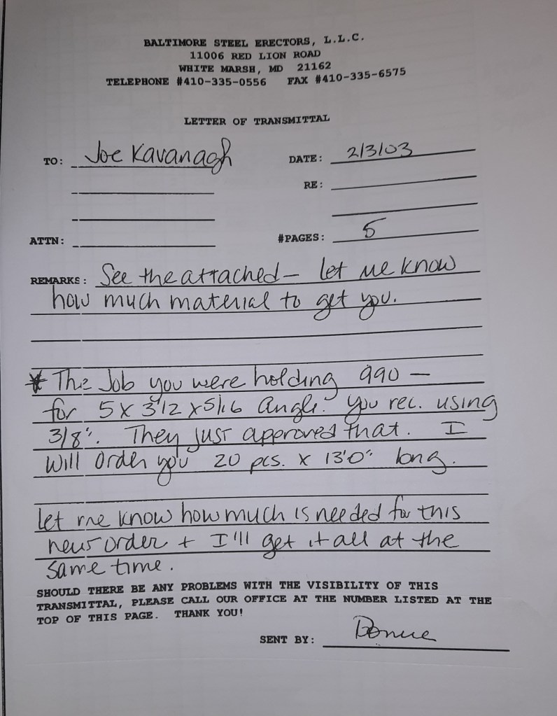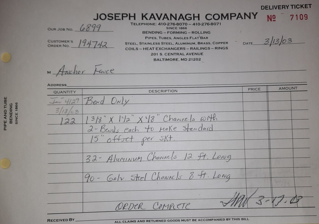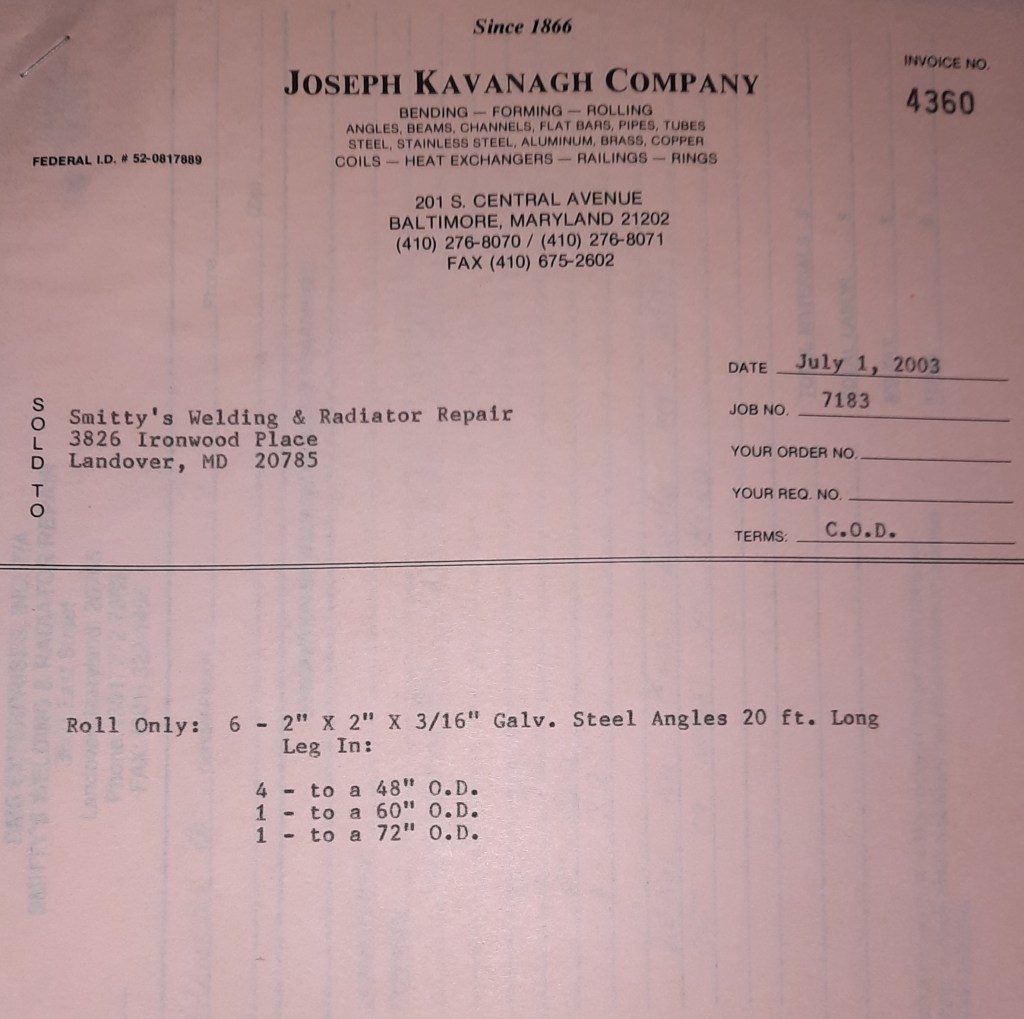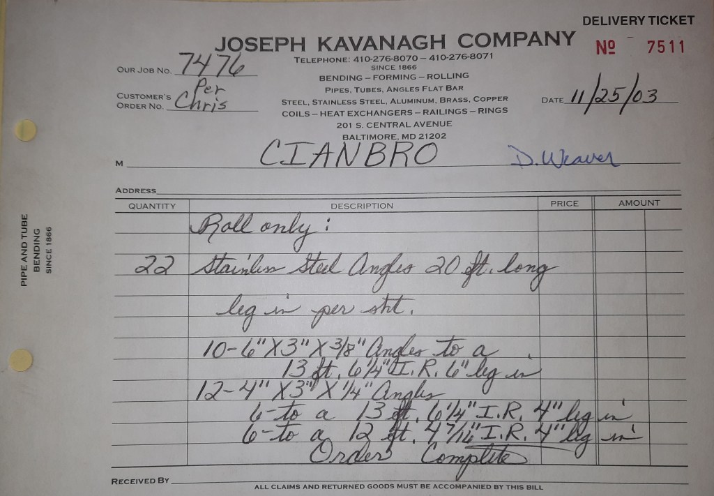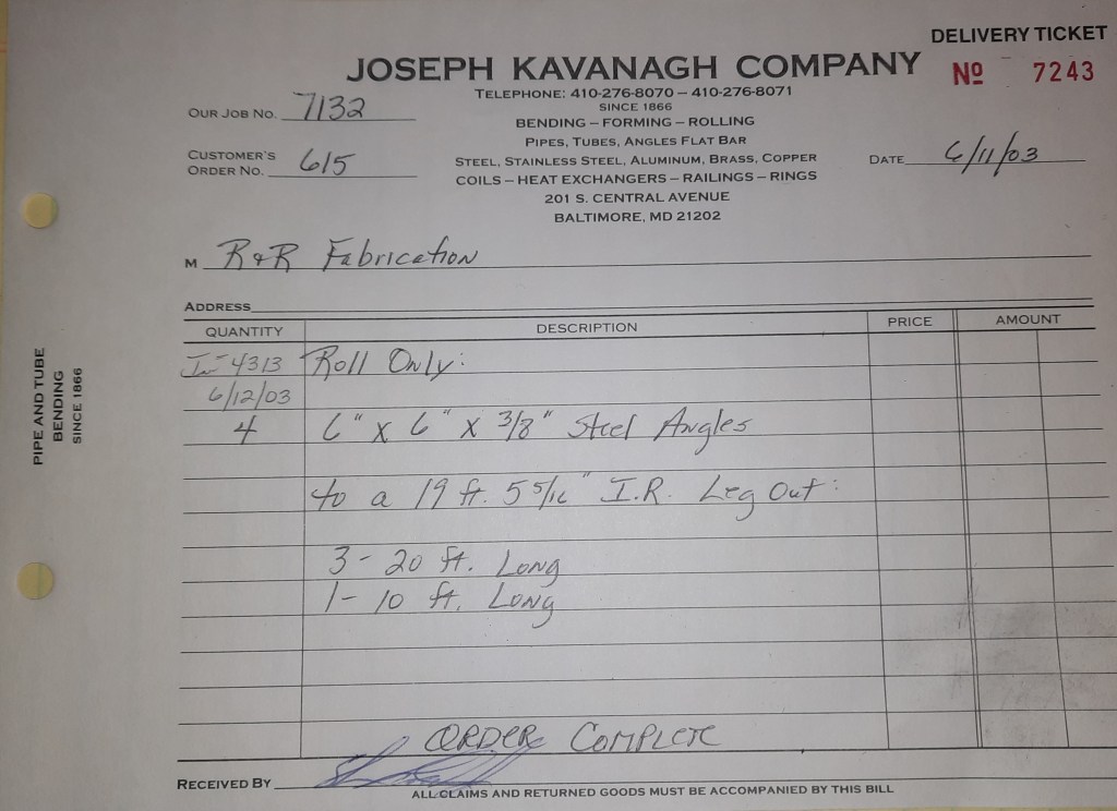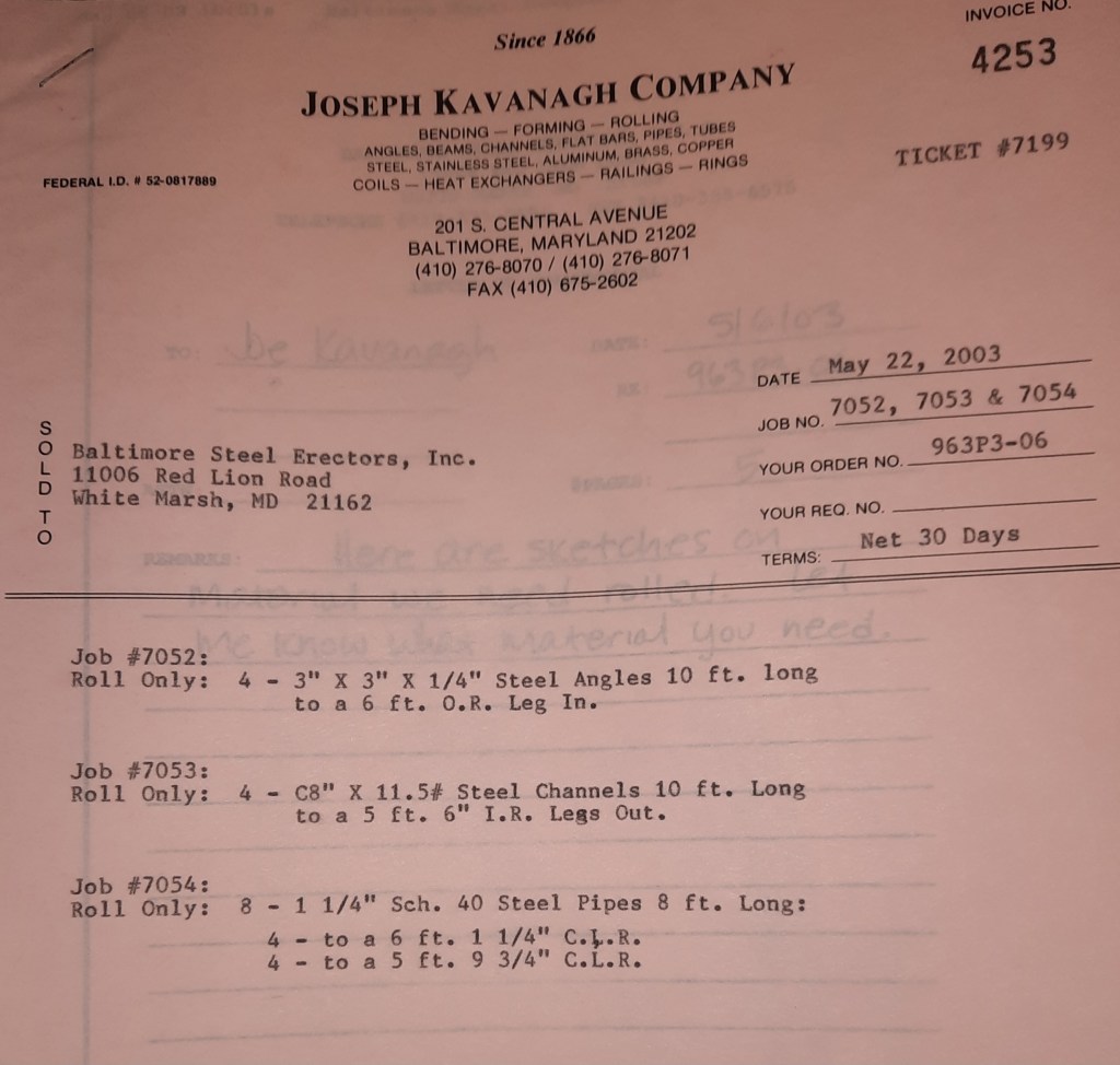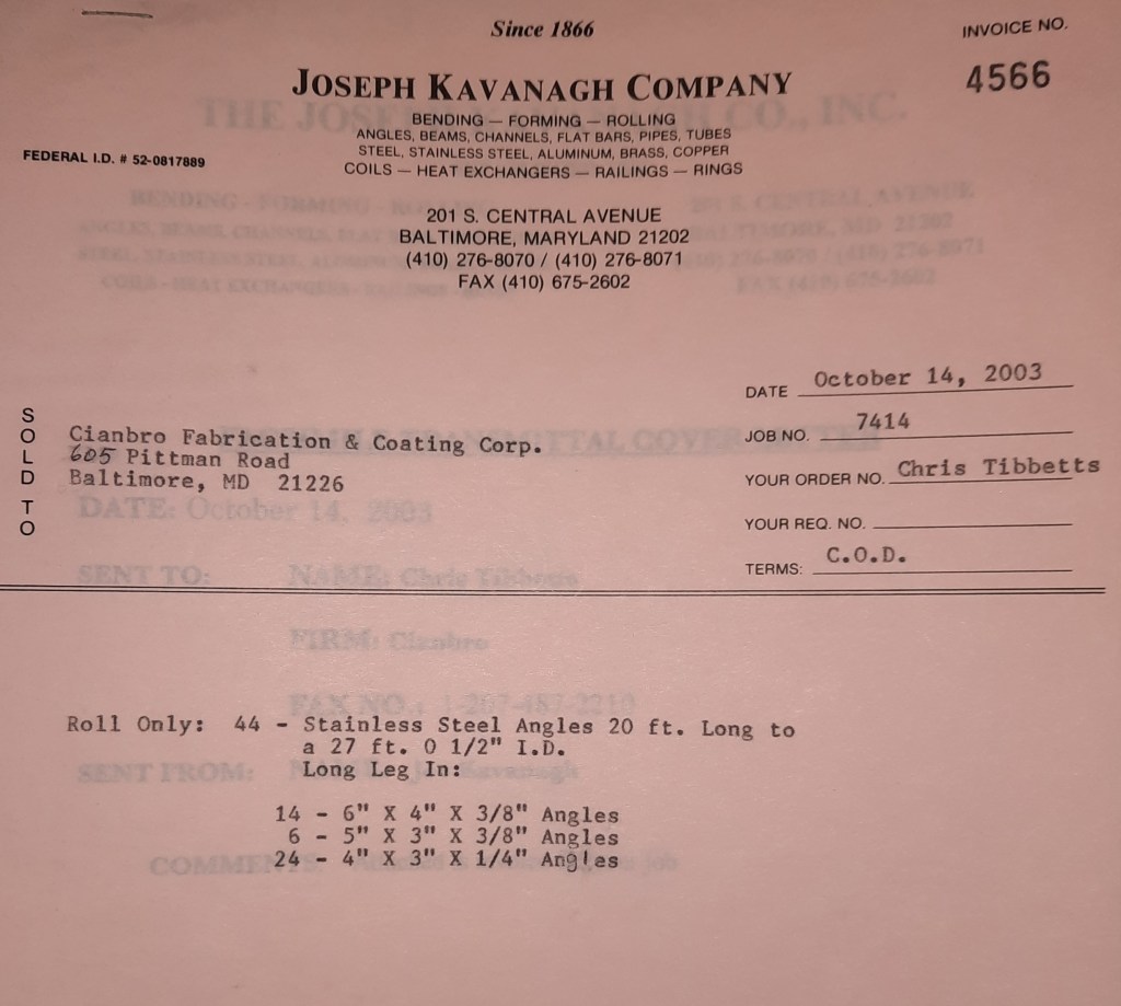 We have received another stainless steel angle order from CIANBRO. The Red Sox lost to the Yankees in seven games so now New York is playing the underdog Florida Marlins in the World Series. As indicated on Chris’ fax, we are both pulling for the Marlins. We agree anybody but the Yankees. This is another good sized order but we also have a couple of smaller jobs in the works today including a small boat rail. After work, Jack and I meet Adrian at 8100 Lynhurst Road. Adrian has the keys to the gate and building and we walk through. It’s not perfect but it’s close enough. My brother and I like the building, the property and the location. It’s even about five minutes from the beltway. We’ll talk about it with Ann tomorrow then move forward with the realtors if she agrees.