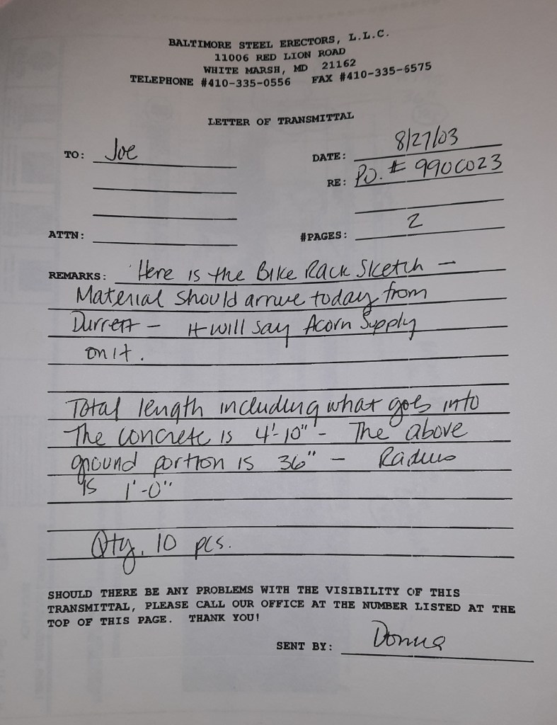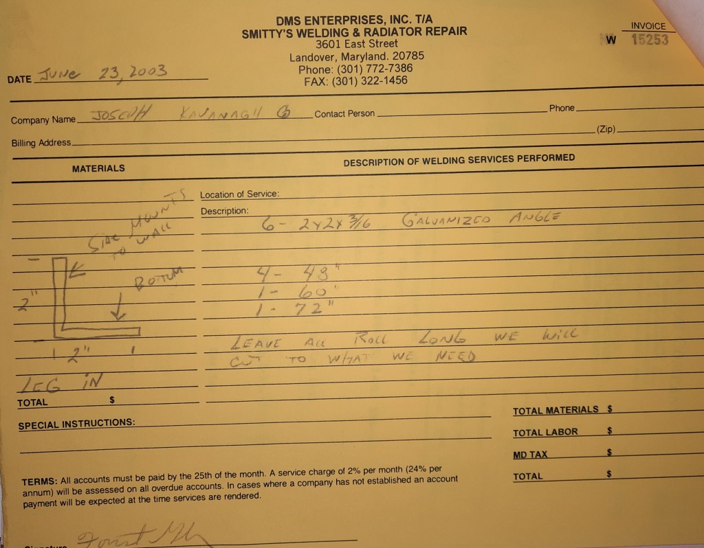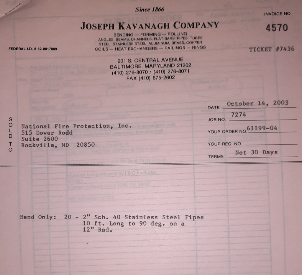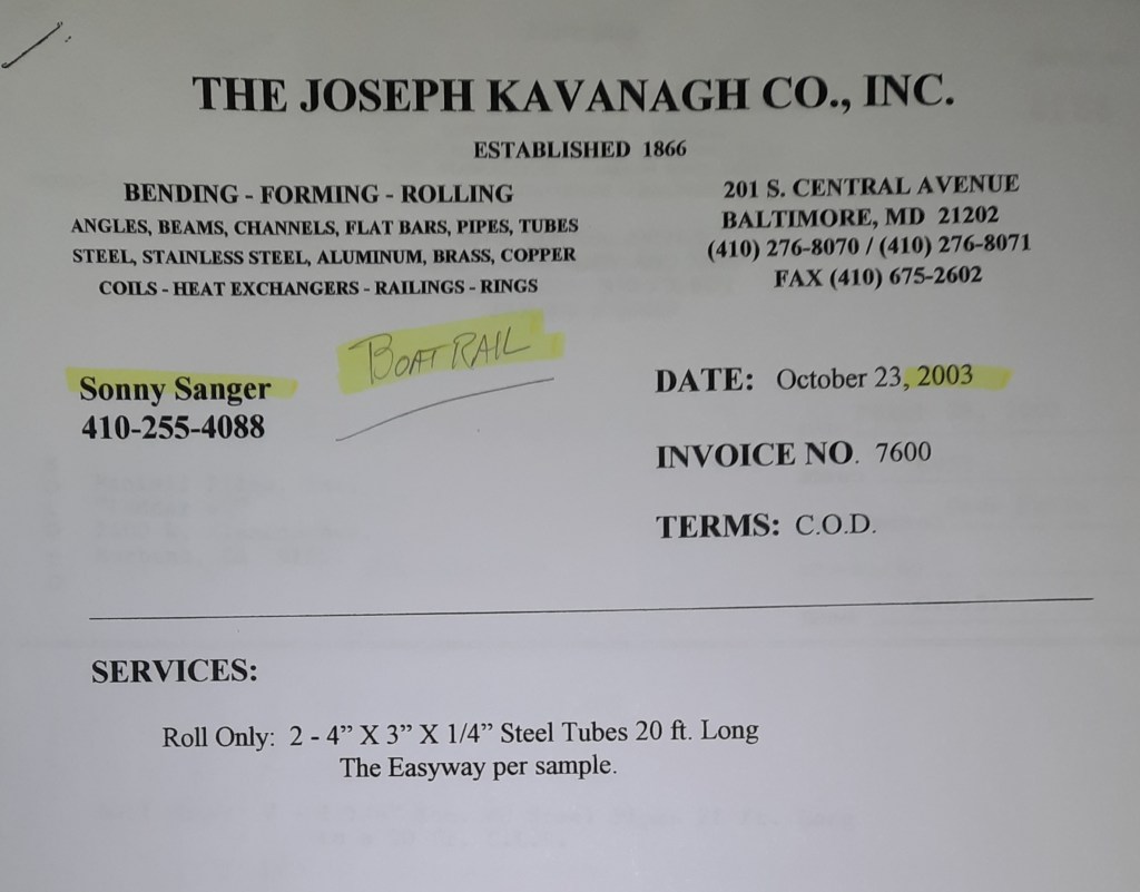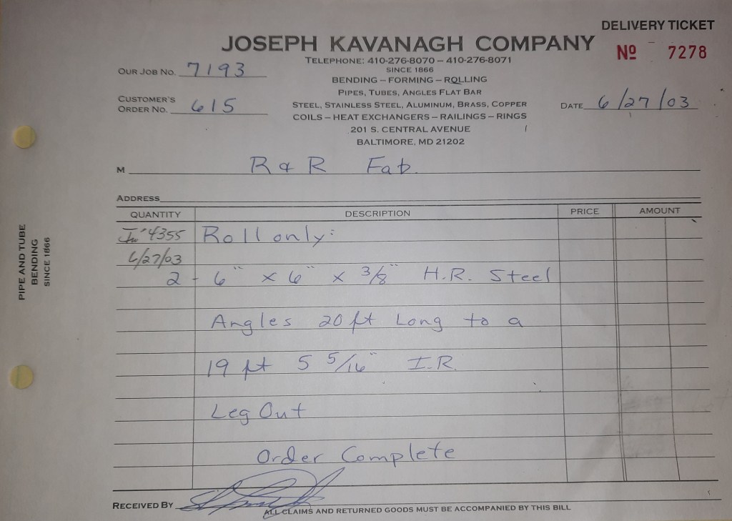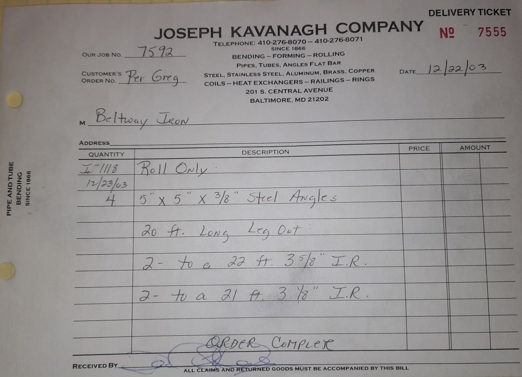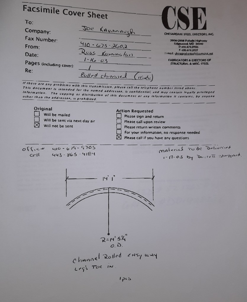 We have received another stainless steel angle order from CIANBRO. The Red Sox lost to the Yankees in seven games so now New York is playing the underdog Florida Marlins in the World Series. As indicated on Chris’ fax, we are both pulling for the Marlins. We agree anybody but the Yankees. This is another good sized order but we also have a couple of smaller jobs in the works today including a small boat rail. After work, Jack and I meet Adrian at 8100 Lynhurst Road. Adrian has the keys to the gate and building and we walk through. It’s not perfect but it’s close enough. My brother and I like the building, the property and the location. It’s even about five minutes from the beltway. We’ll talk about it with Ann tomorrow then move forward with the realtors if she agrees.