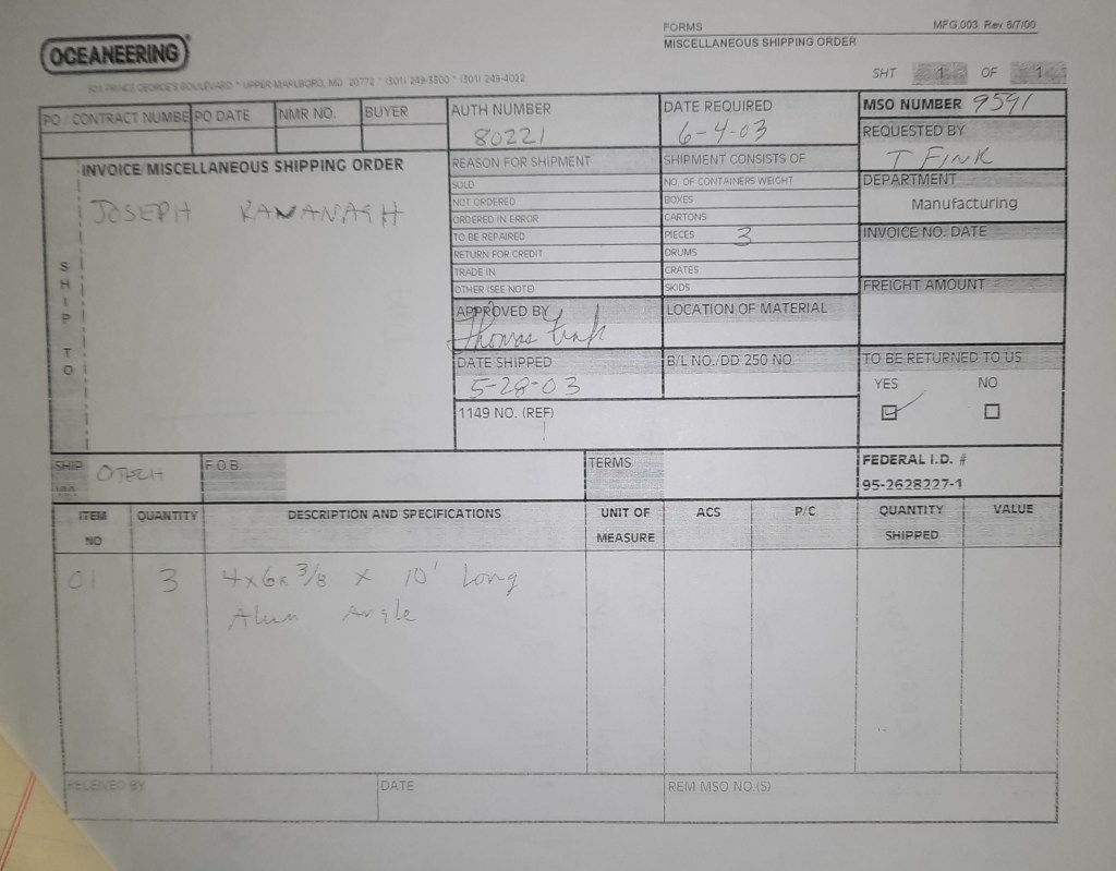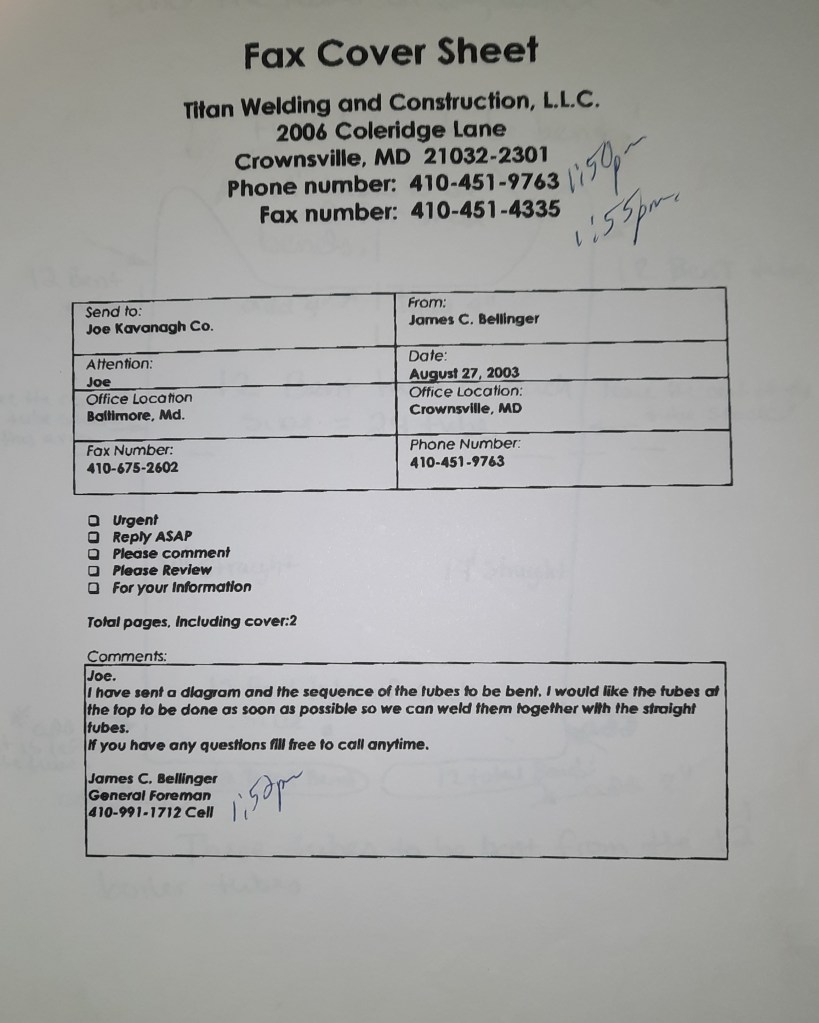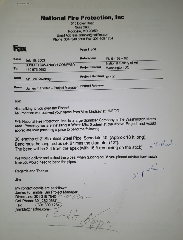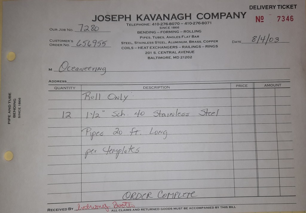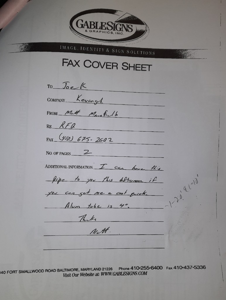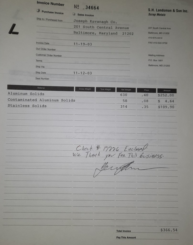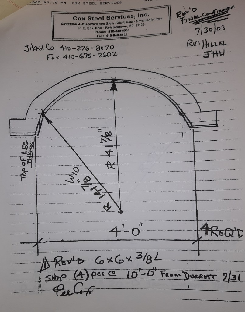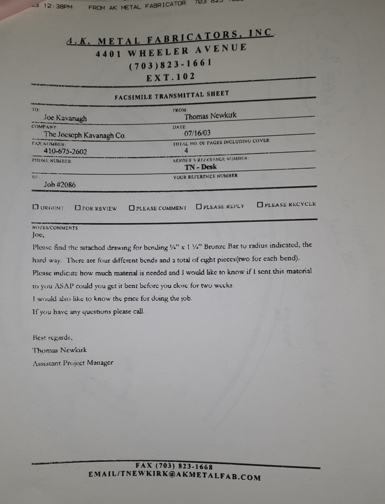 We have received another stainless steel angle order from CIANBRO. The Red Sox lost to the Yankees in seven games so now New York is playing the underdog Florida Marlins in the World Series. As indicated on Chris’ fax, we are both pulling for the Marlins. We agree anybody but the Yankees. This is another good sized order but we also have a couple of smaller jobs in the works today including a small boat rail. After work, Jack and I meet Adrian at 8100 Lynhurst Road. Adrian has the keys to the gate and building and we walk through. It’s not perfect but it’s close enough. My brother and I like the building, the property and the location. It’s even about five minutes from the beltway. We’ll talk about it with Ann tomorrow then move forward with the realtors if she agrees.