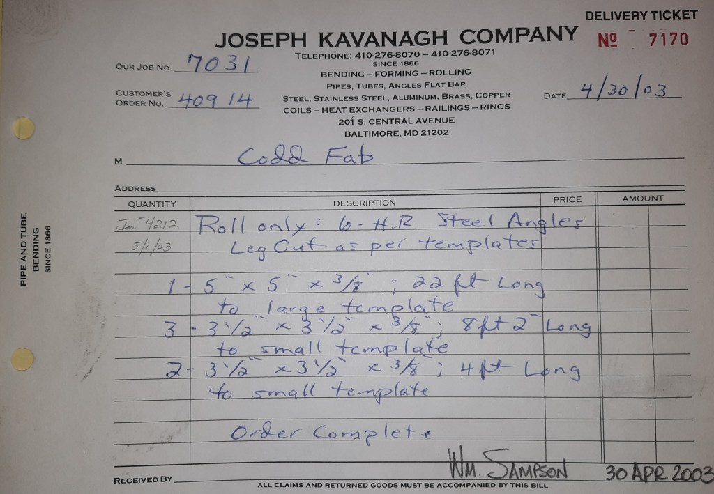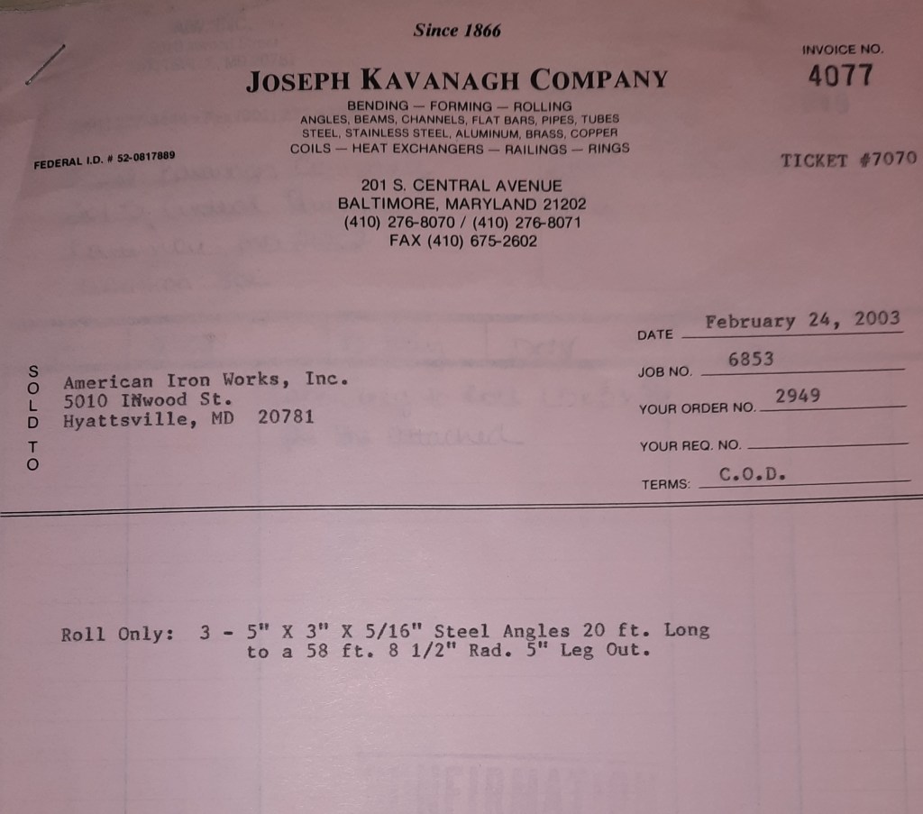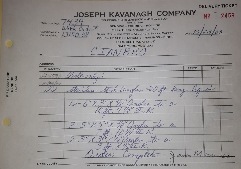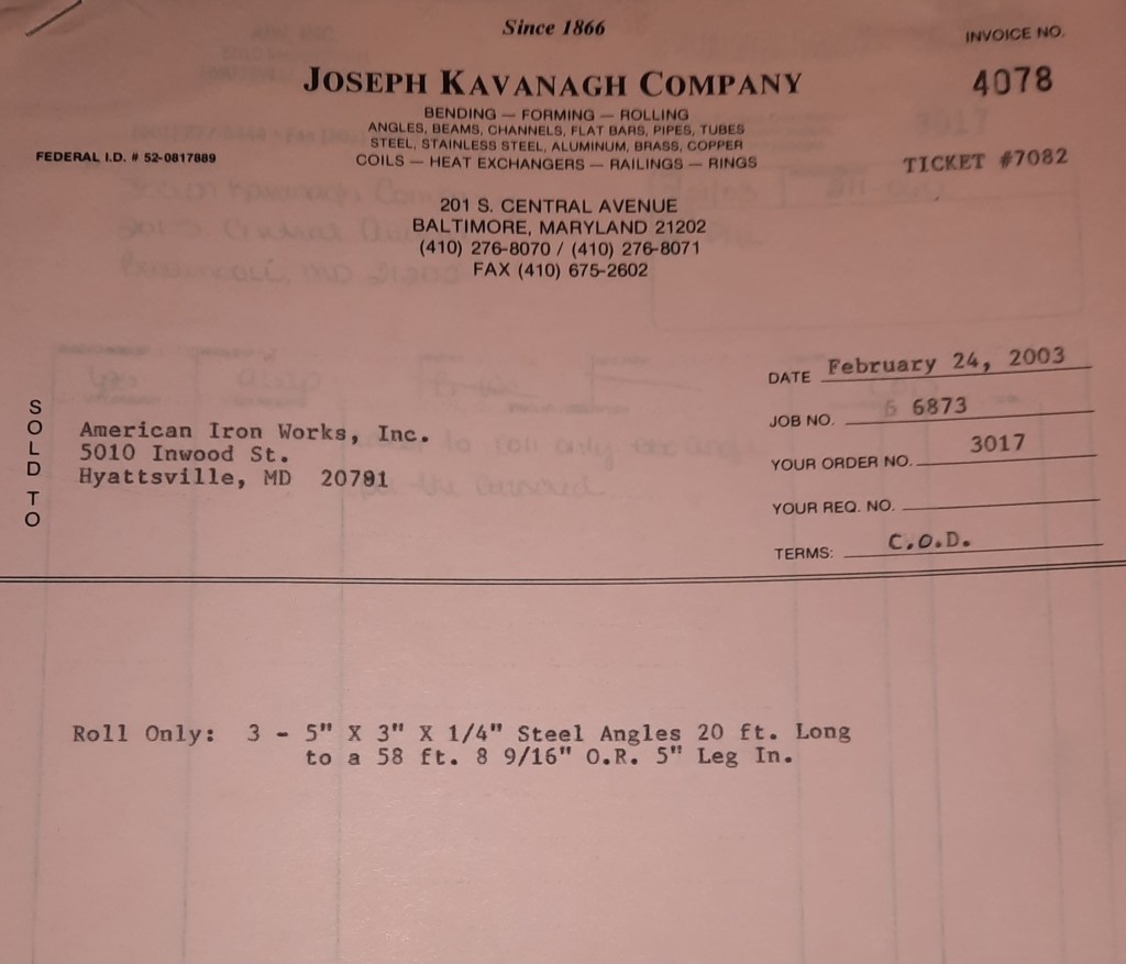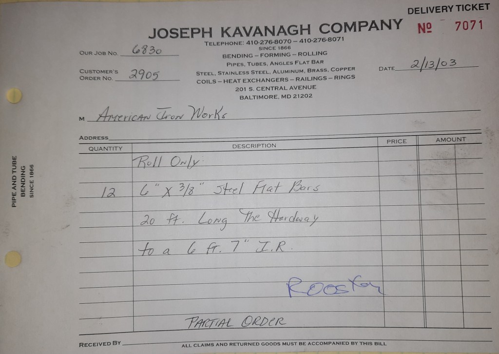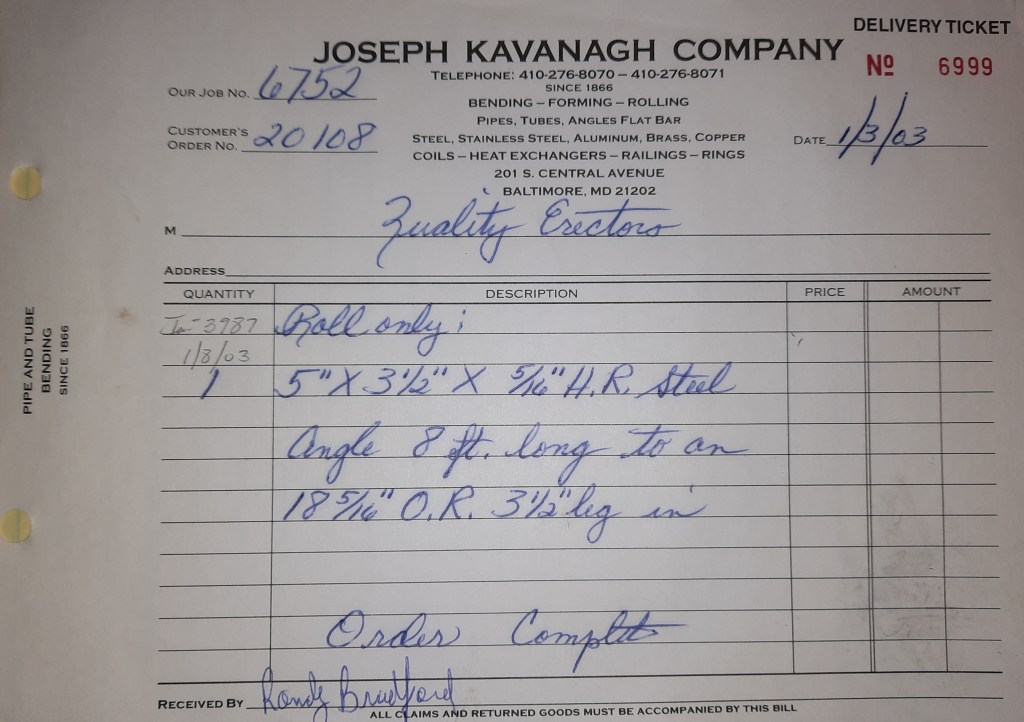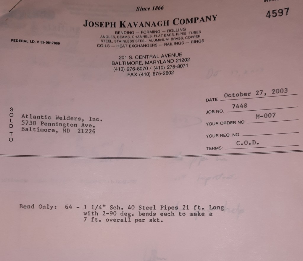 It’s a pleasant Spring day at the Shop and the crew remain busy. We finish another job for “Ladder 49” and two orders for Codd Fabricators. We also receive some surprising news about Codd. They are going out of business. The Kauffmans are selling the building and they will be closed before the end of the year. Ann, Jack and I are pretty shocked. Codd Fabricators has been a customer for a hundred years and one of our biggest for as long as I have worked here. It’s strange to think they are closing and we are considering moving. An odd coincidence that shows how much things are changing in our industry and in Baltimore.