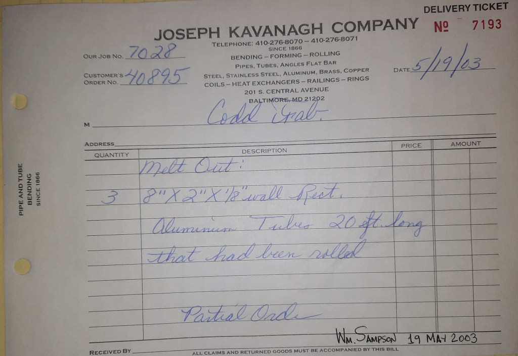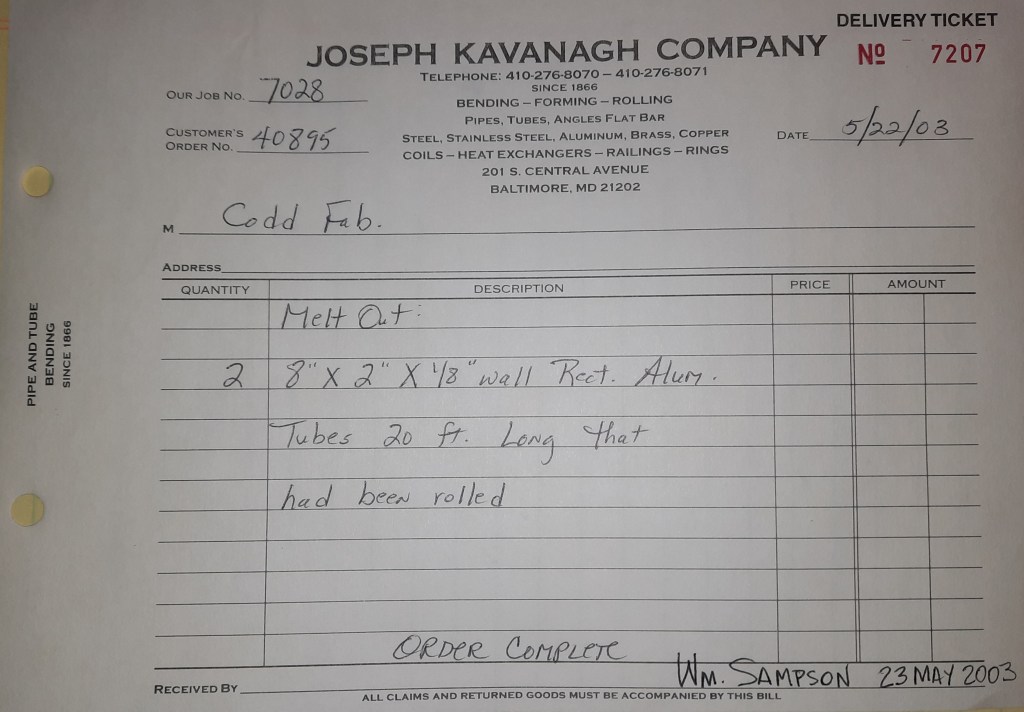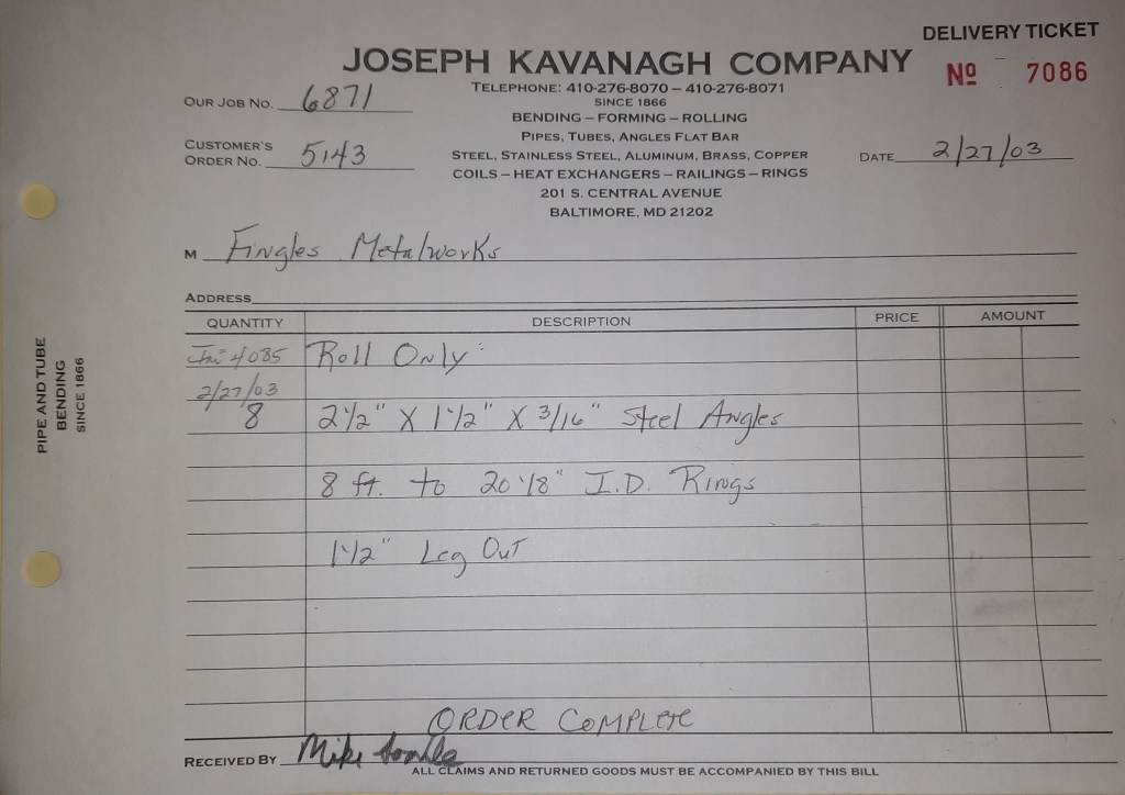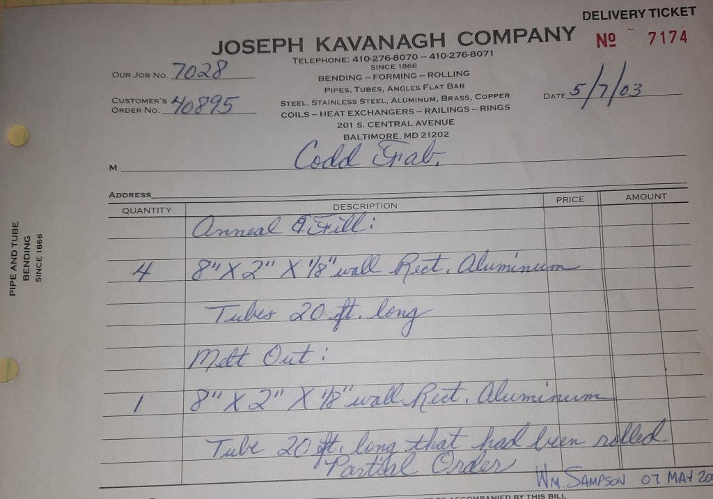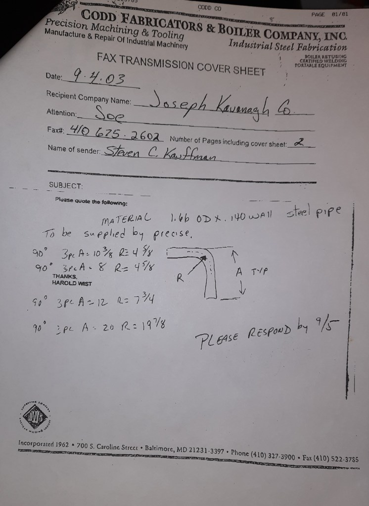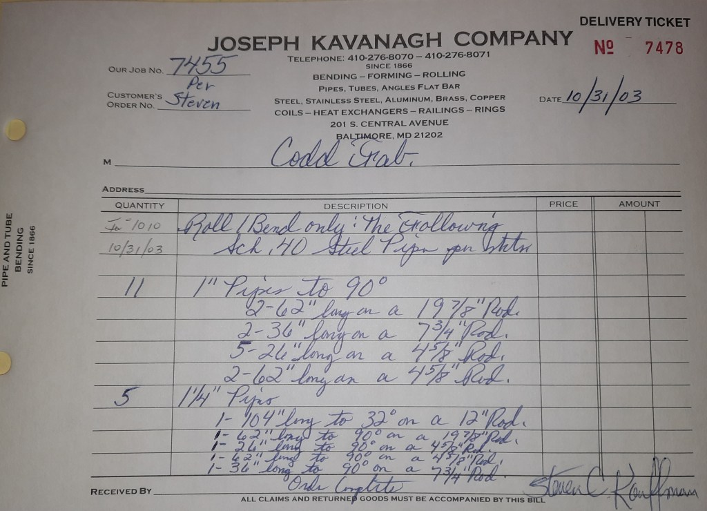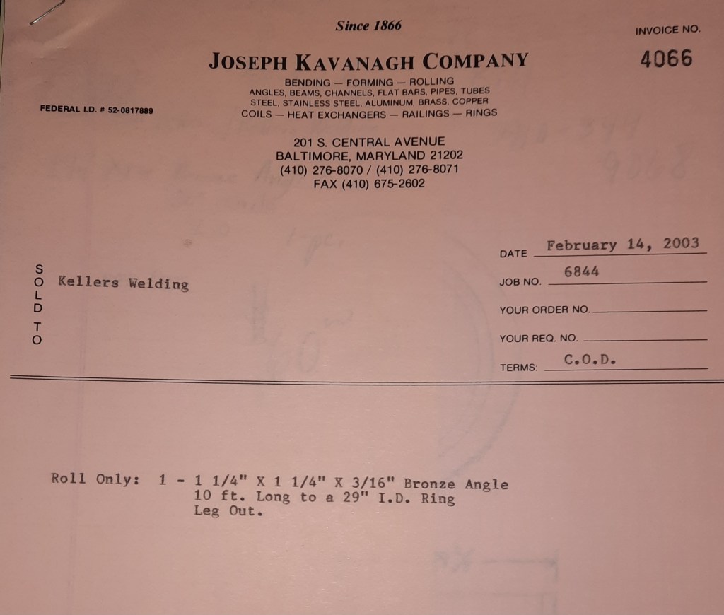 Codd Fabricators has closed its doors. This company began six years before the Joseph Kavanagh Company in 1860. They’ve been customers since the early 1900’s and during my father’s time, they were our most regular and reliable customer. We have had work for them in the Shop if not every week, every other week. I will miss dealing with them. The Kauffman’s are good people and I enjoyed working with them. We wish them good luck but it is certainly a sign of changing times.