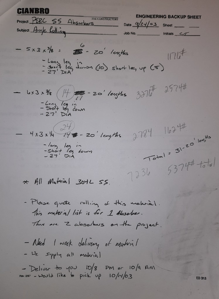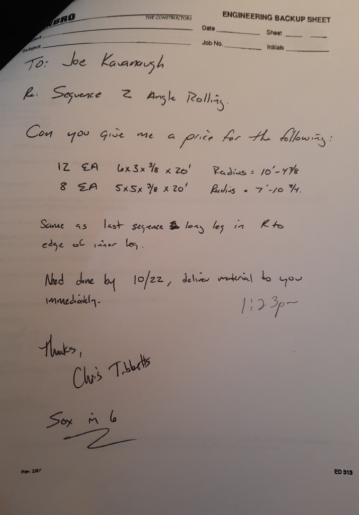 The Shop has received an order from CIANBRO for some stainless steel angles. They will be used for a set of water tanks. The full job will be in several phases and likely last several months. CIANBRO does work all over the East Coast but they are based out of Boston. I discuss the baseball playoffs with their rep who calls me, Chris Tibbets and he is in fact, a Red Sox fan. The Orioles finished in fourth place so no postseason for them. The Sox and the Yanks are squaring off in the American League Championship Series. I am an Orioles’ fan but I wish him luck as I can’t help but root for whoever is playing the Yankees.