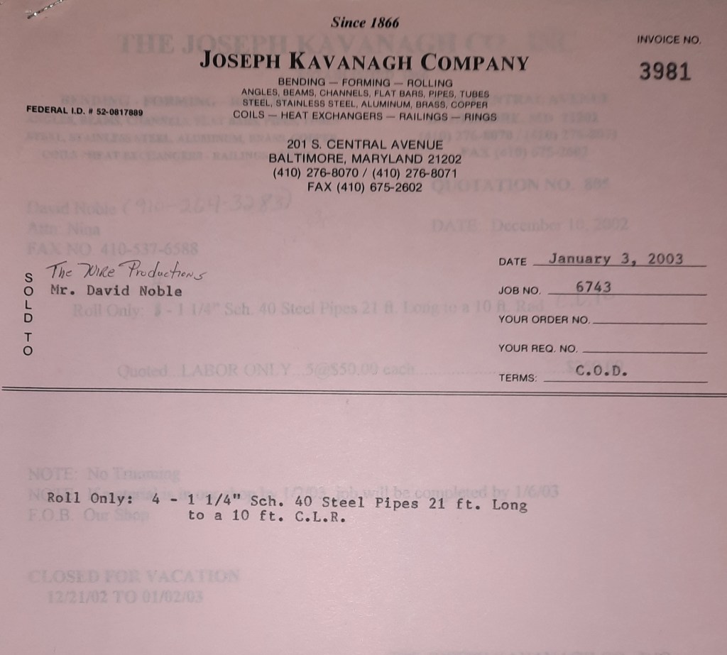 We returned to work yesterday after the holidays and it’s a Friday so the consolation prize of returning to the Shop is a short week. We had some work on the books when we got back, some from our regulars and one for the HBO television show, “The Wire.” I get a kick out of the jobs for TV or films. It’s certainly more interesting than rolled angle rings or pipe railings. I drive down and pick up turkey clubs from Haussner’s for lunch and we discuss the idea of moving from Central Avenue. We’ve all thought about it and though interested, we’re all a little hesitant. It’s been a busy two days back at the Shop so we decide to keep thinking about it for a bit then make a decision.