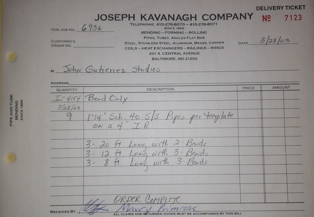 The US begins bombing Baghdad this evening and tomorrow the Iraq War will officially begin. The United States and its allies believe Saddam Hussein and his regime have weapons of mass destruction and are connected to the terrorist group, al-Qaeda. After threatening military action if Hussein did not leave Iraq, President Bush orders bombing and then a land assault. The US is joined by the United Kingdom, Australia and Poland in a coalition against Iraq and Hussein. I watch the news coverage from home and tomorrow I’ll do so on our small television in the office. As far as the Shop goes, we are busy but not swamped. A couple jobs were completed today including a rolled pipe order for sculptor Rodney Carroll.